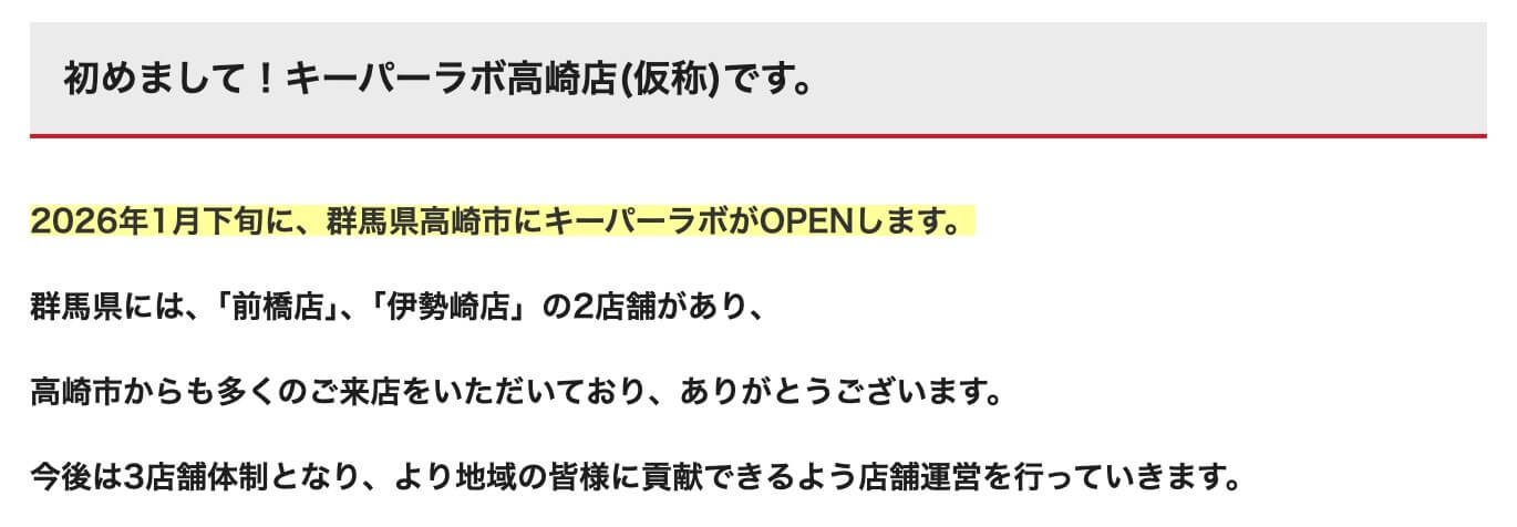 ▼『キーパーラボ高崎店(仮称)』のオープン情報(公式サイトより)