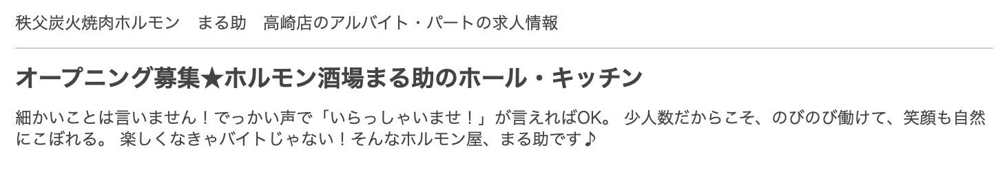 ▼『秩父炭火焼肉ホルモン まる助 高崎店』のオープン情報(求人情報より)
