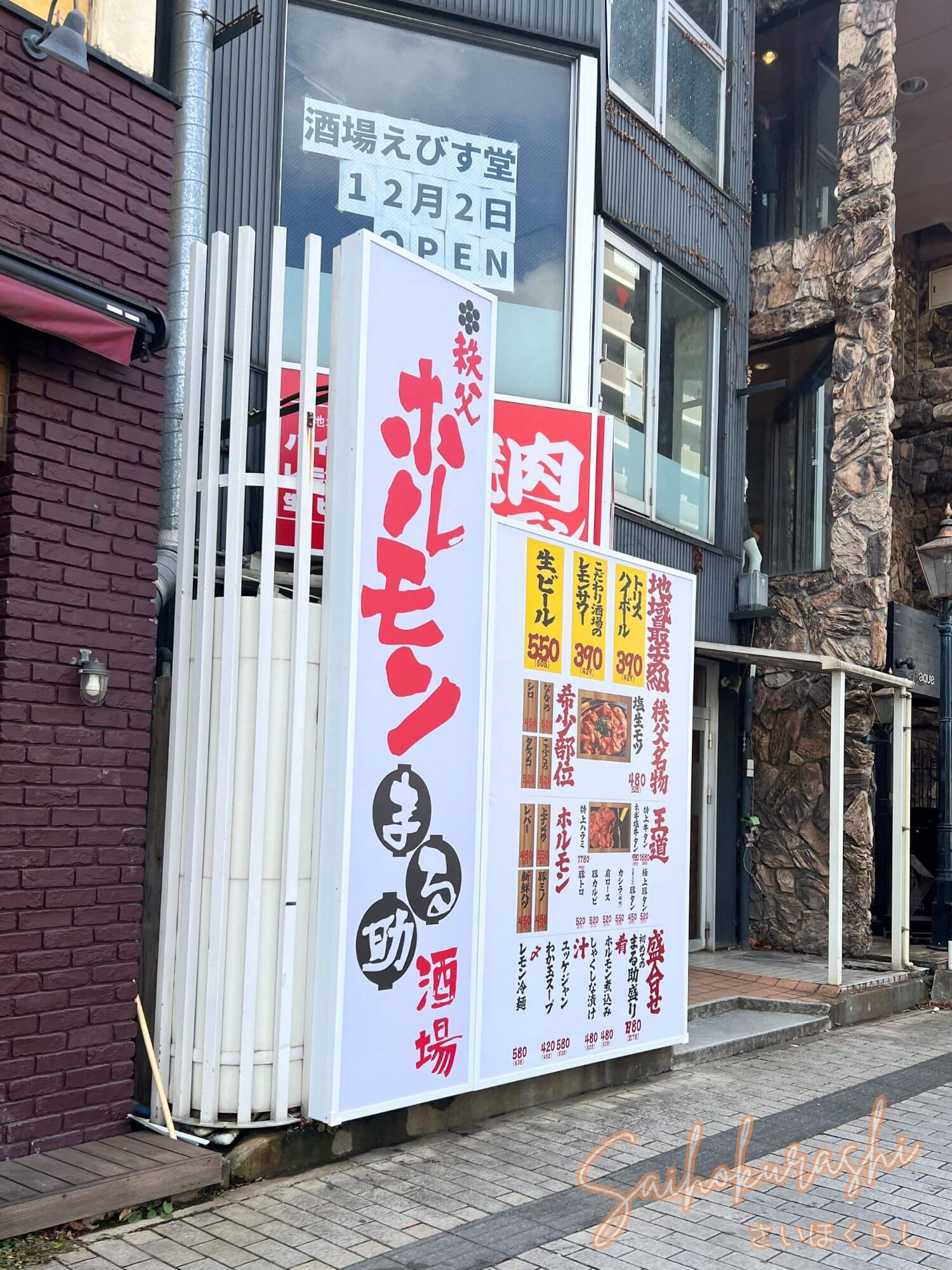 ▼「秩父炭火焼肉ホルモン まる助 本庄駅前店」