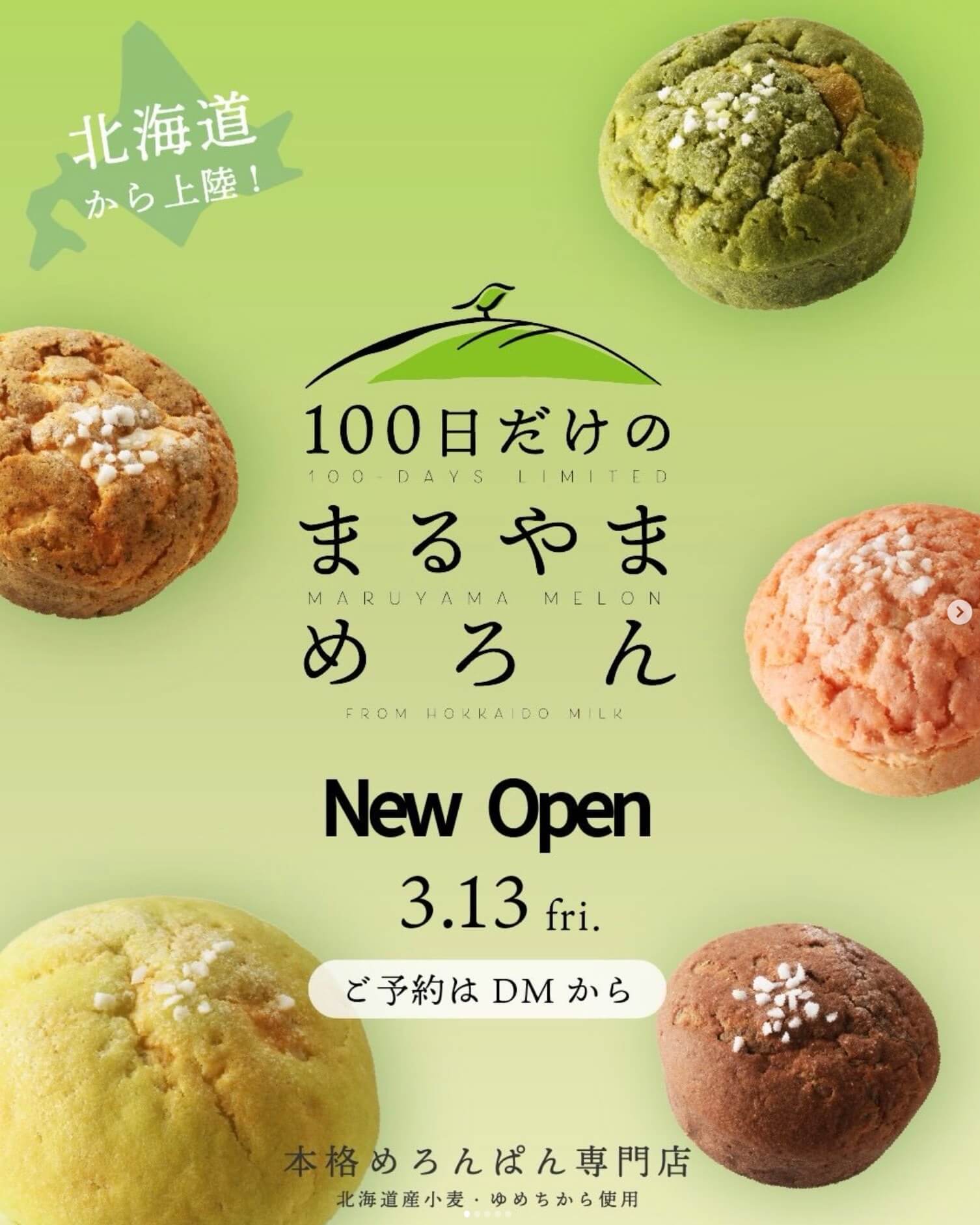 『100日だけのまるやまめろん』は、北海道で人気のメロンパン専門店ブランド。北海道小麦を使用した本格的なメロンパンを販売するお店で、店名の通り期間限定での出店として注目を集めそうです。