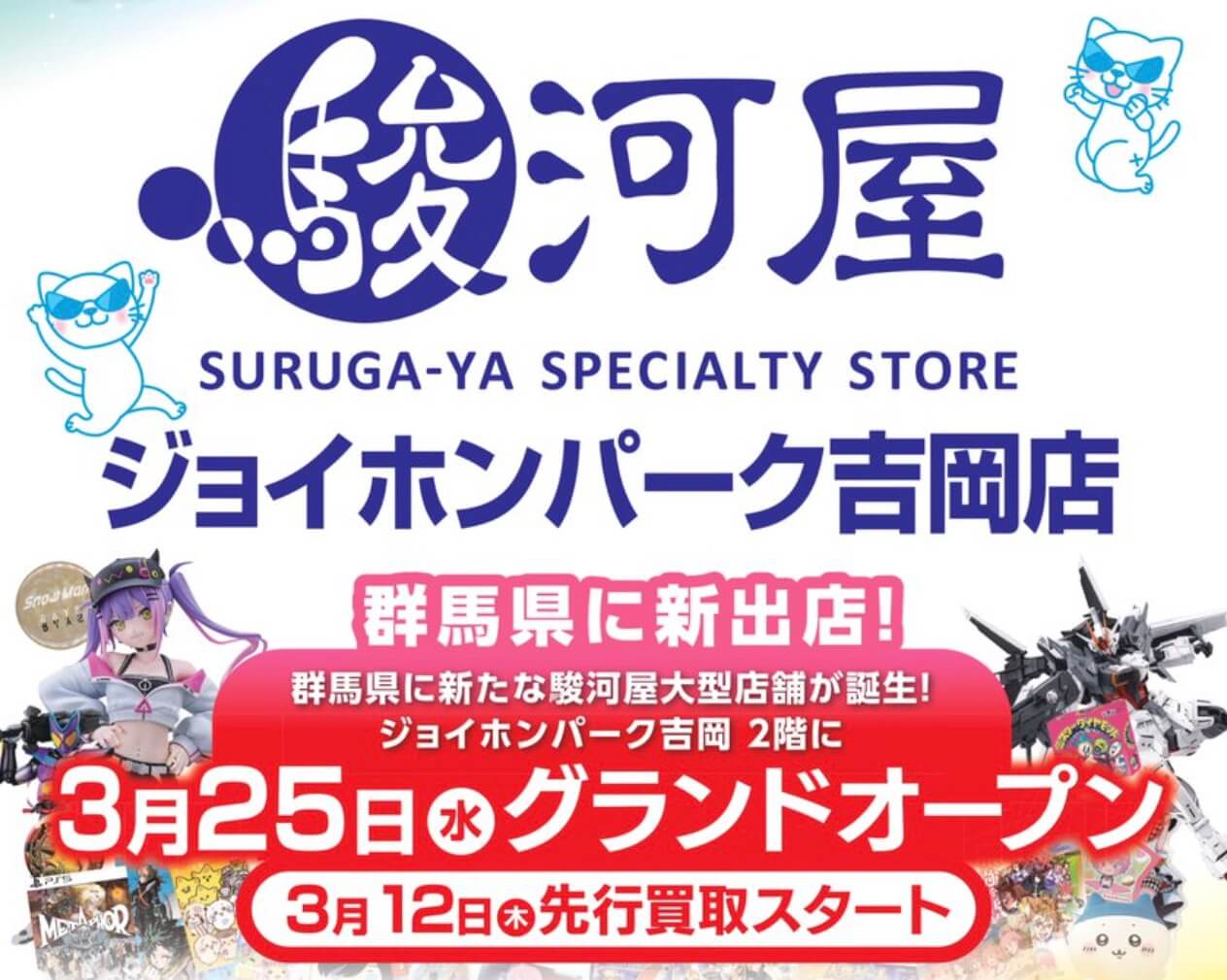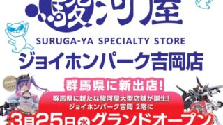 群馬県北群馬郡吉岡町のジョイホンパーク吉岡内に『駿河屋 ジョイホンパーク吉岡店』が2026年3月25日にオープン予定です。フィギュア・アニメグッズ・ゲーム・トレカなどを扱う人気ショップで、オープンに先がけて2026年3月12日から先行買取も開始される予定です。