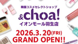 埼玉県羽生市のイオンモール羽生専門店街1階に、韓国コスメセレクトショップ『&choa!(アンドチョア)』が2026年3月20日にオープン予定です。定番の韓国コスメから話題のスキンケアまで、最新の韓国トレンドアイテムを集めたセレクトショップとして展開される予定です。