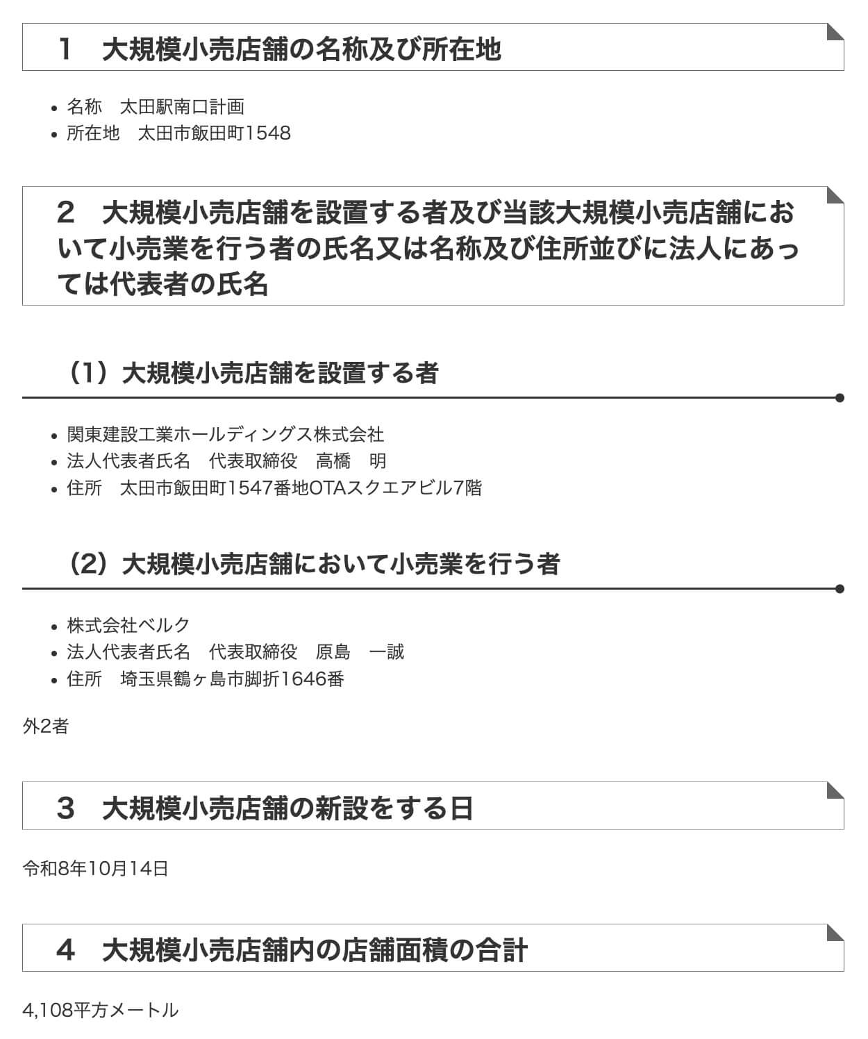 群馬県の公告で「太田駅南口計画」の新設届出が掲載され、小売業者としてスーパーマーケット『ベルク』の出店予定が明らかになりました。