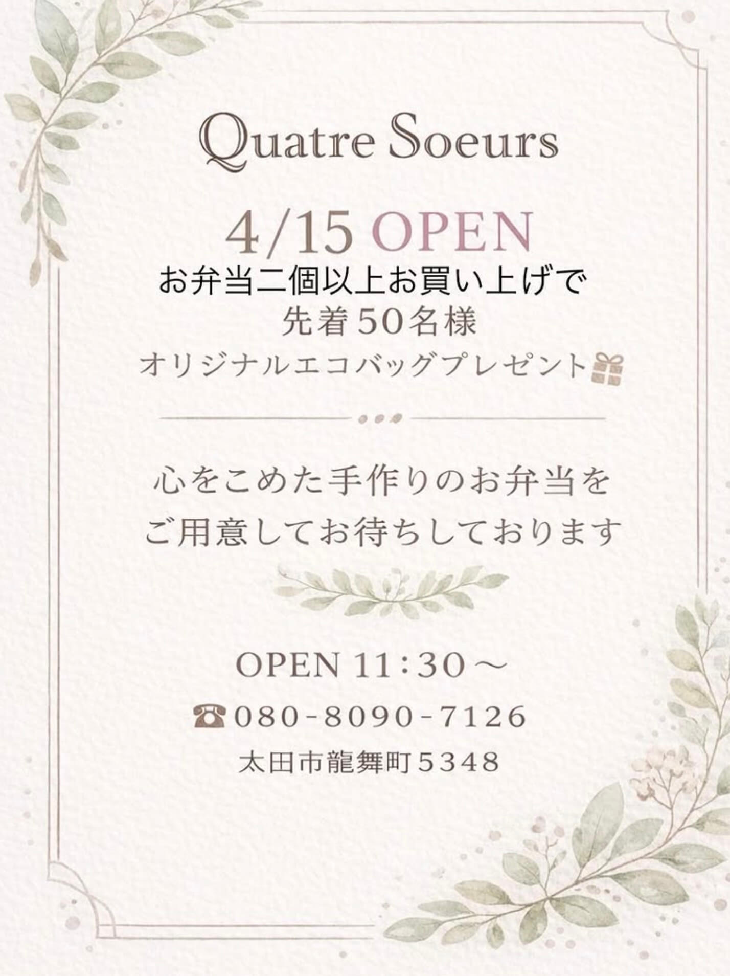 【新店】太田市龍舞町に手作り弁当のお店『Quatre Soeurs(キャトルスール)』が2026年4月15日オープンしたようです!