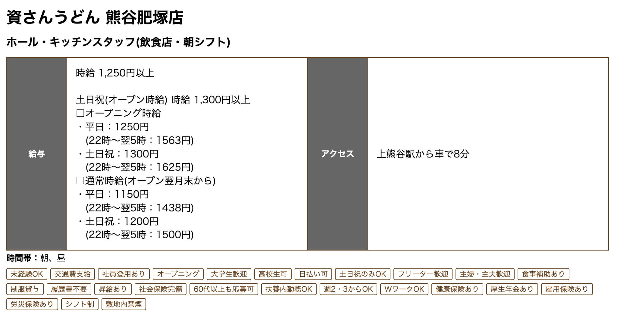 募集内容では『資さんうどん 熊谷肥塚店』の店舗名が記載されており、オープン時給やアクセス情報なども案内されています。