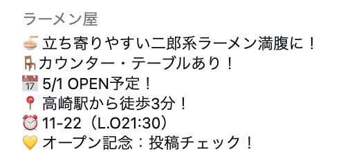 『らーめん たん二郎 高崎駅西口店』のオープン情報(公式Instagramより)