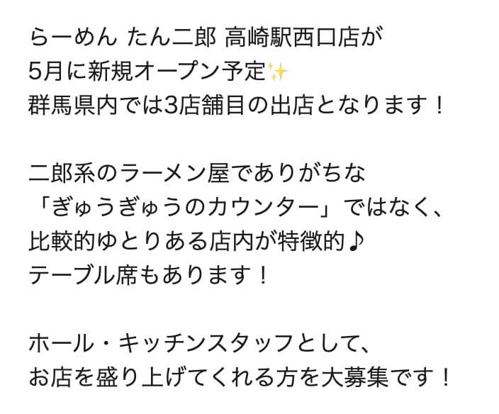 『らーめん たん二郎 高崎駅西口店』のオープン情報(求人情報より)