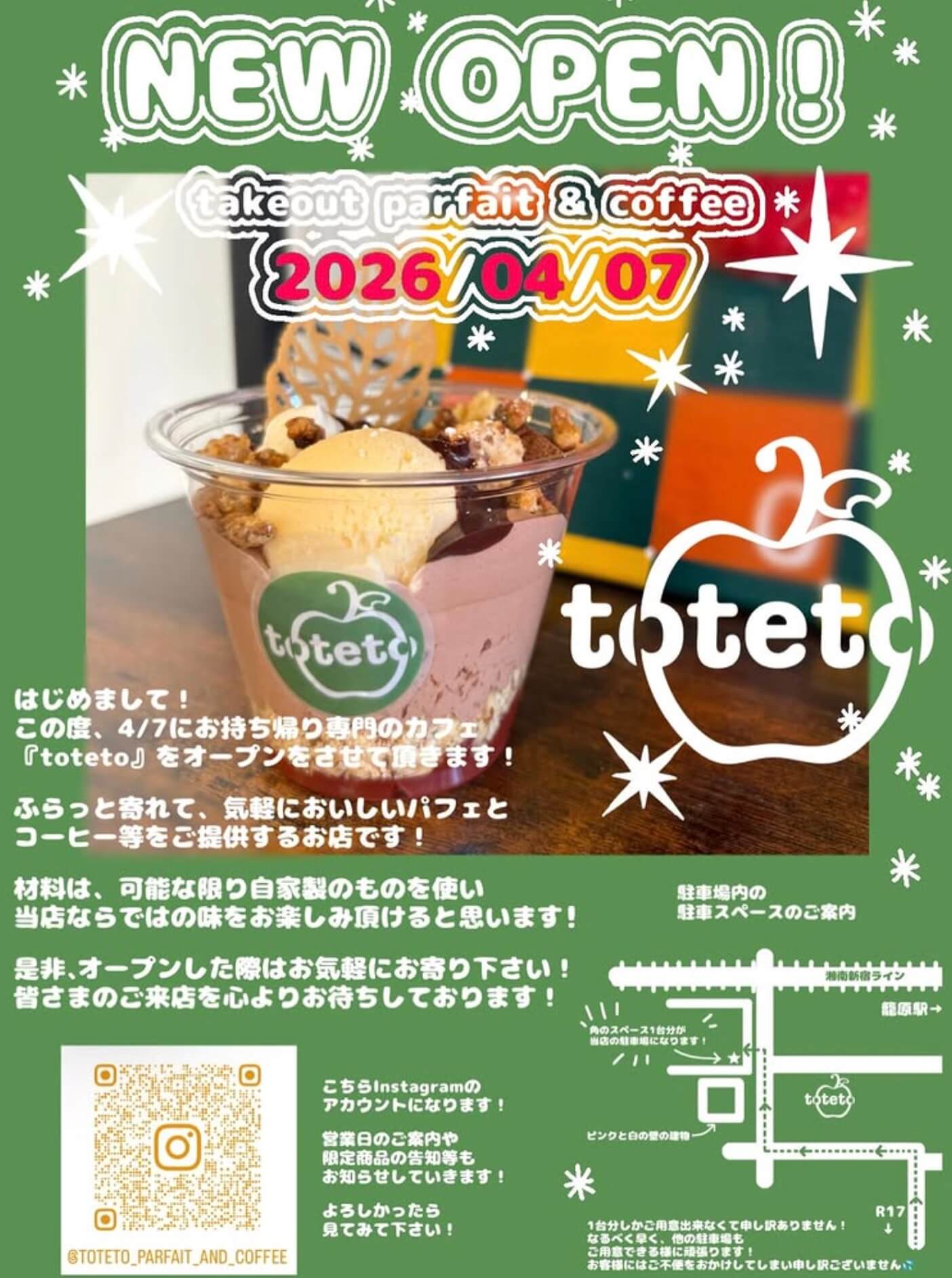 埼玉県熊谷市新堀に、テイクアウト専門カフェ『toteto』が2026年4月7日にオープンしました。