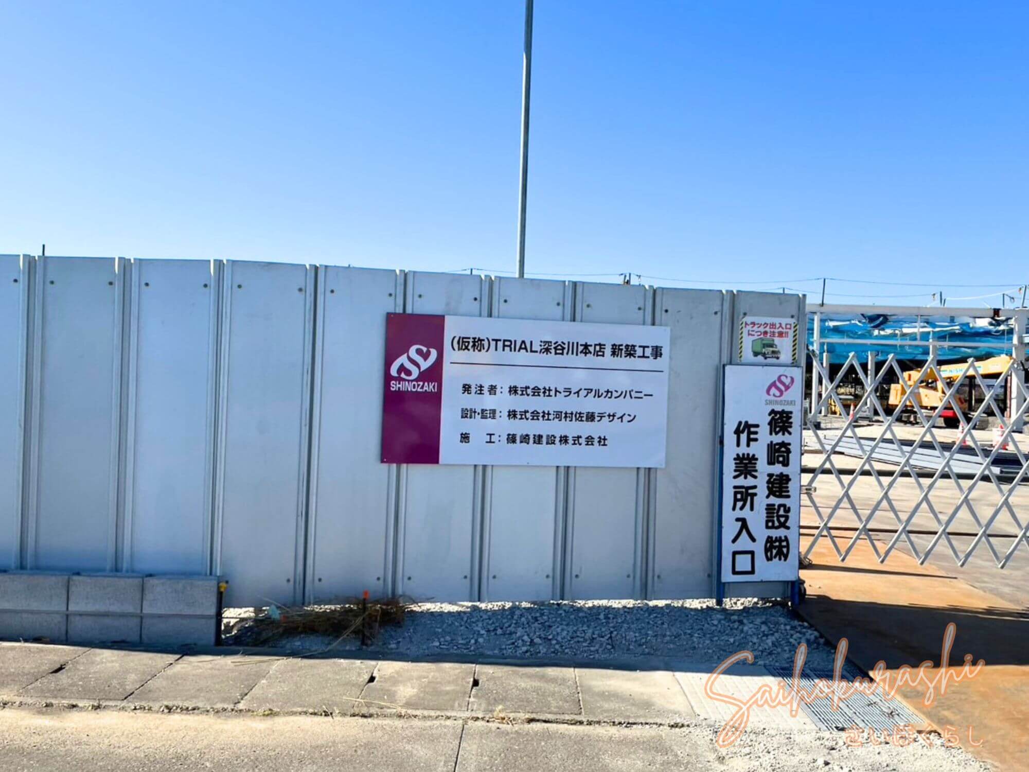 現地ではすでに工事が進められており、工事看板には「(仮称)TRIAL深谷川本店 新築工事」の表記も確認できています。