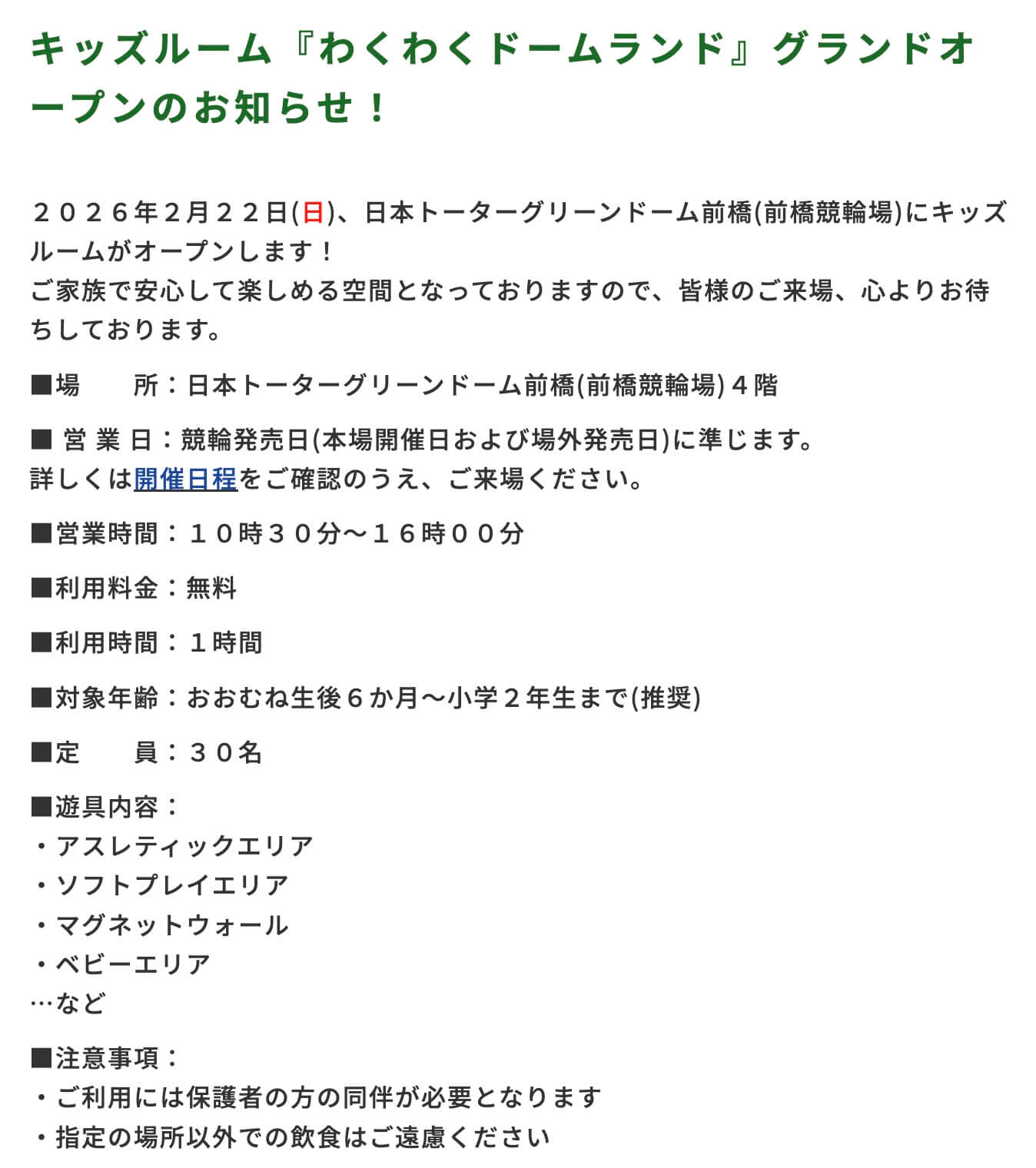 前橋競輪公式の案内では、オープン当日(2/22)に、オープン記念のキッズイベントも予定されています。