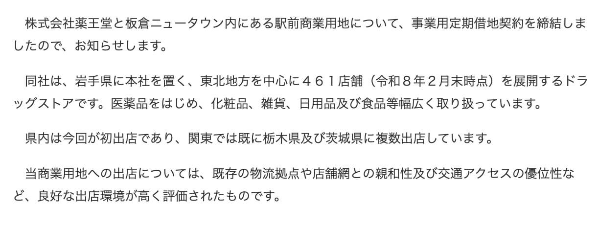 群馬県の発表により、『薬王堂 板倉ニュータウン店』について事業用定期借地契約が2026年3月17日に締結されたことが明らかになりました。