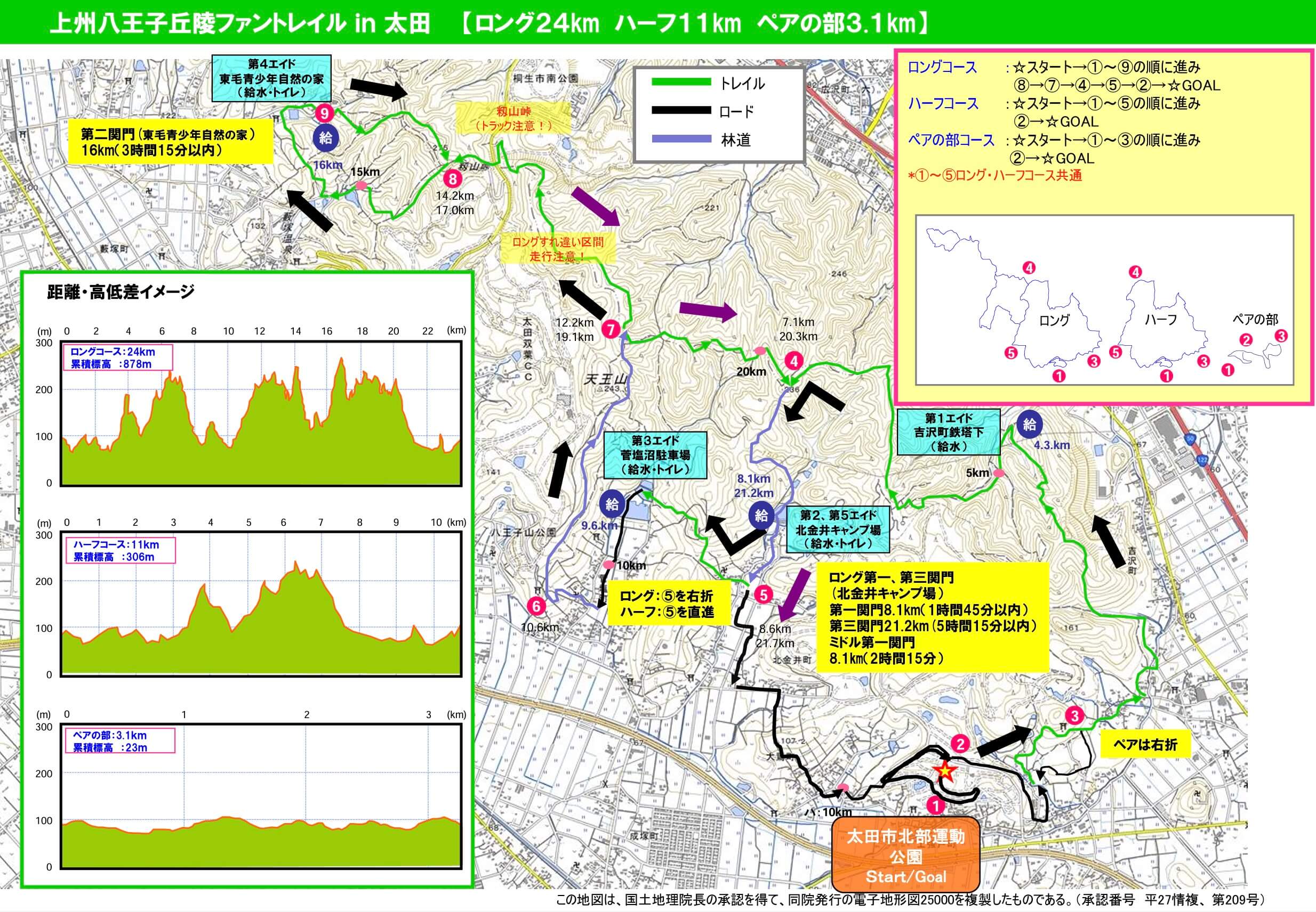 - ロングの部:24km(高校生以上)/8,000円(本格的なトレイルを楽しめる中〜上級者向け)