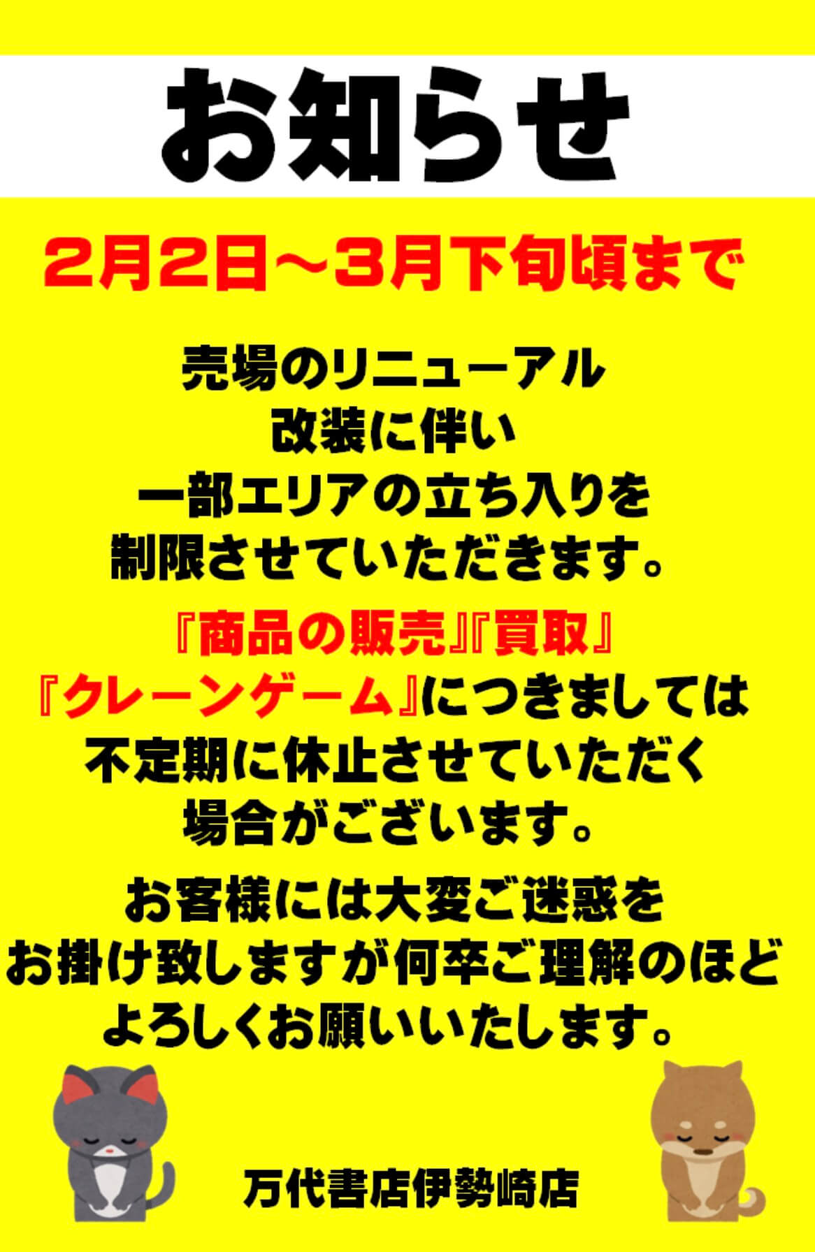 『万代書店 伊勢崎店』のリニューアル&一部エリア制限情報(公式サイトより)