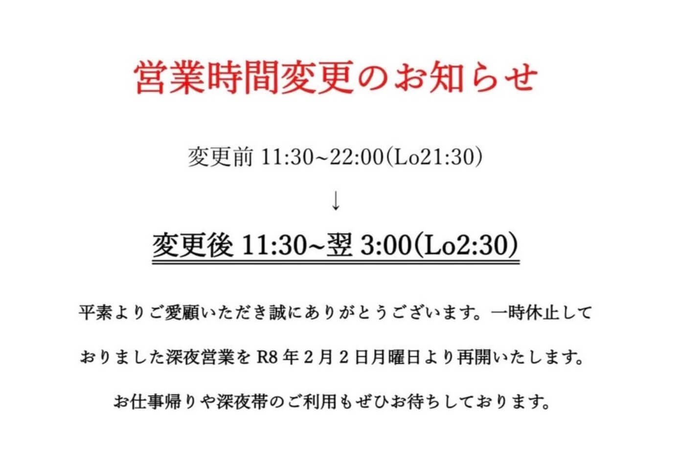 - 変更後:11:30〜翌3:00(L.O.2:30)