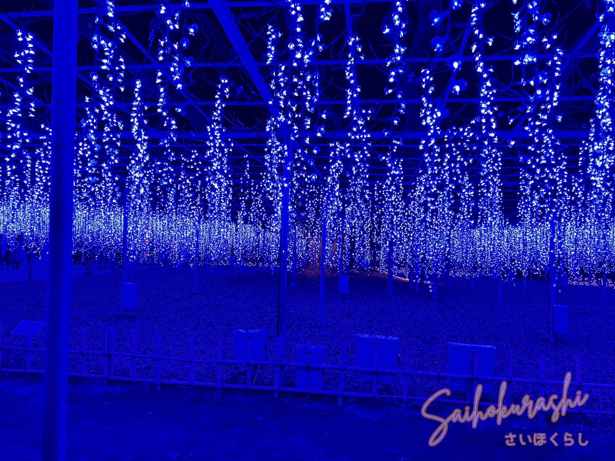 『あしかがフラワーパーク』の見どころでもある大藤エリアは青い光が一面に広がるエリアへ。