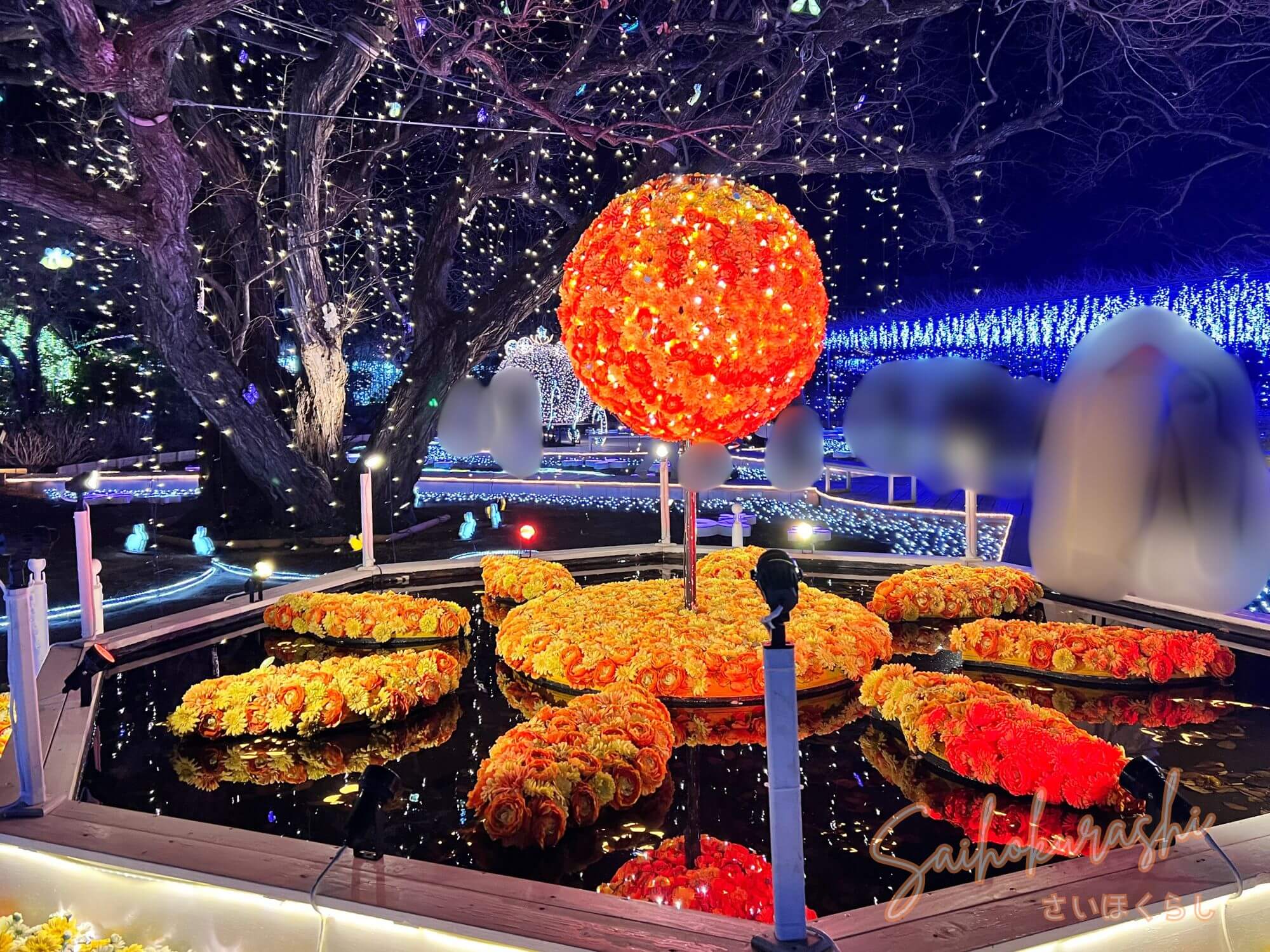 光のトンネルのようなエリア、池に映り込むリフレクション、見上げて楽しむライトなど、視点を変えると写真の雰囲気もガラッと変わります。