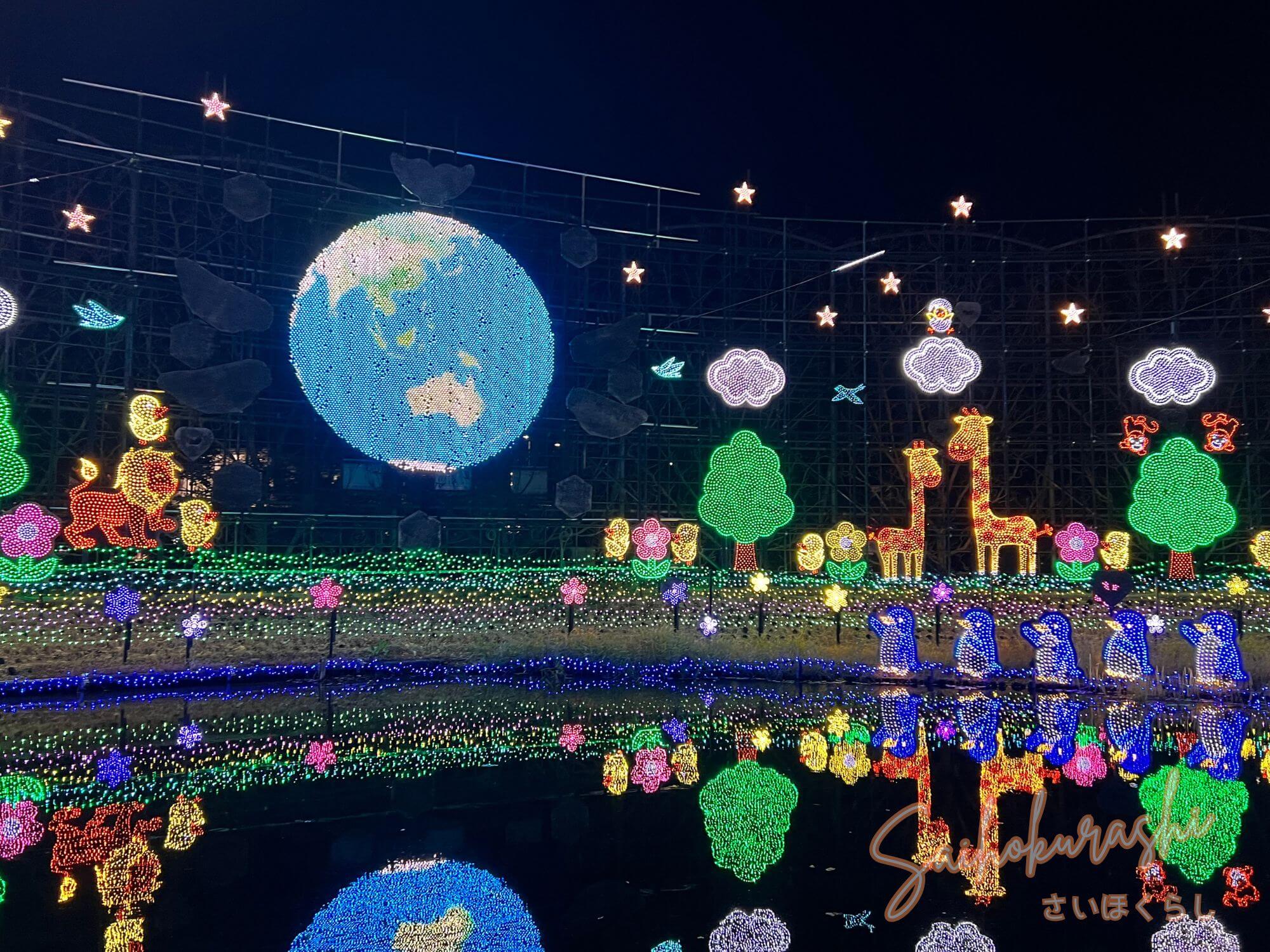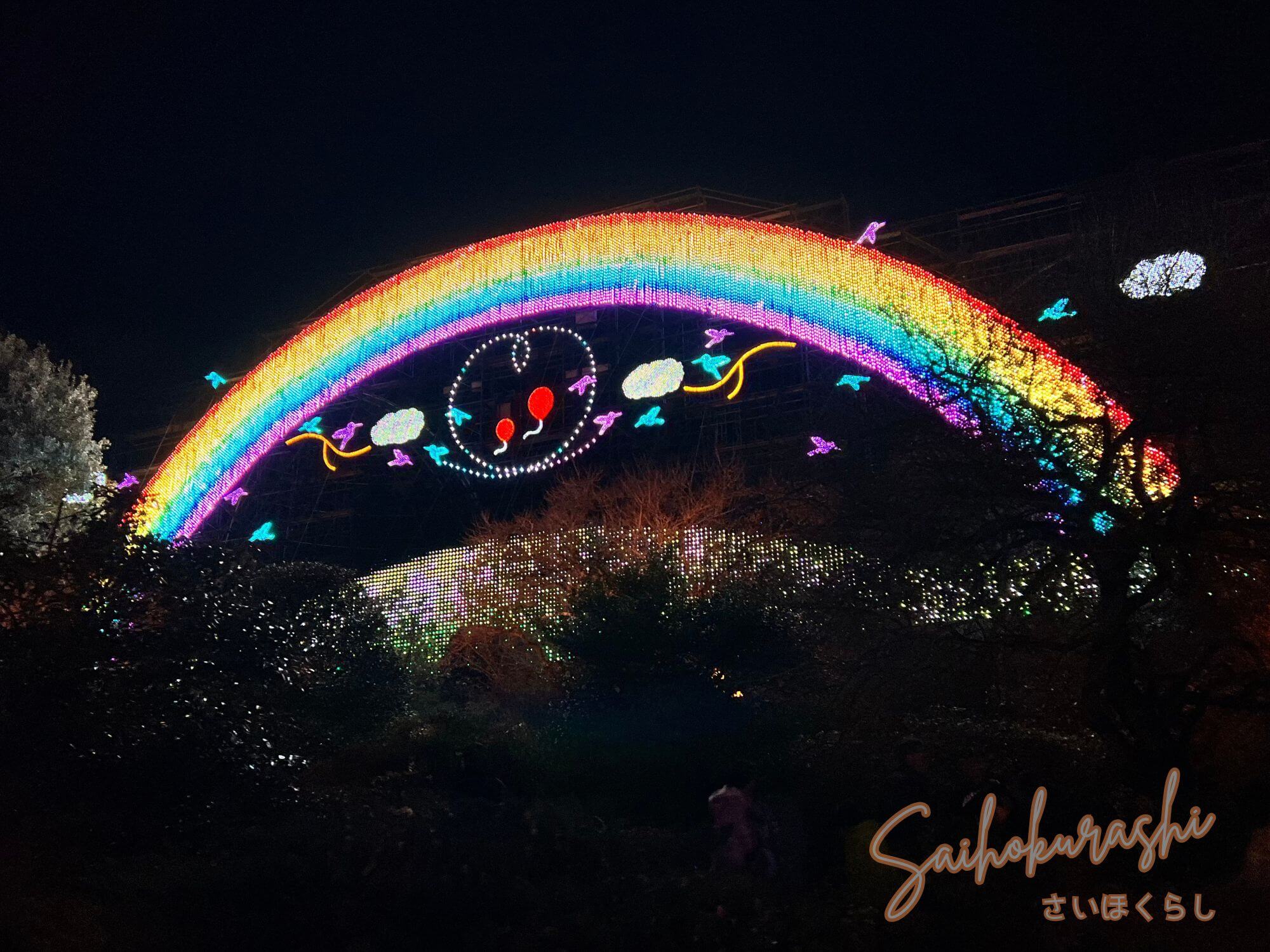 虹のアーチや、動物・花をモチーフにしたライトアップなど、“分かりやすくワクワクする”見どころが多め。