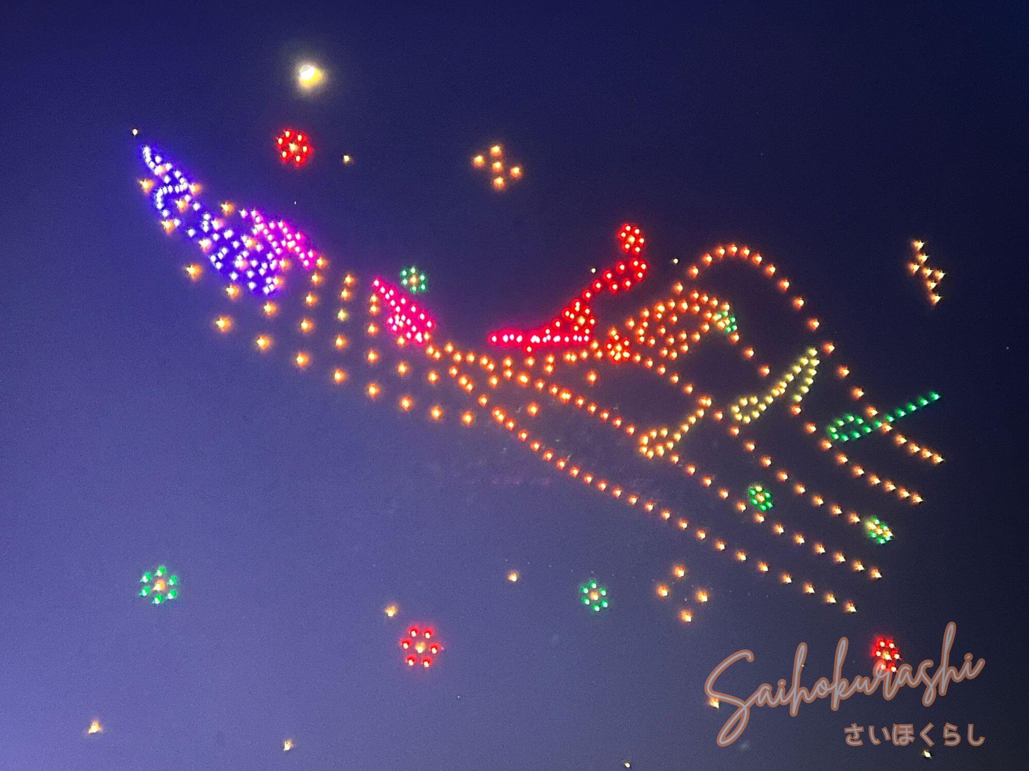 夜空にドローンが浮かび上がり、カラフルな光で図柄が描かれていく演出は、イルミネーションとはまた別の“特別感”がありました。