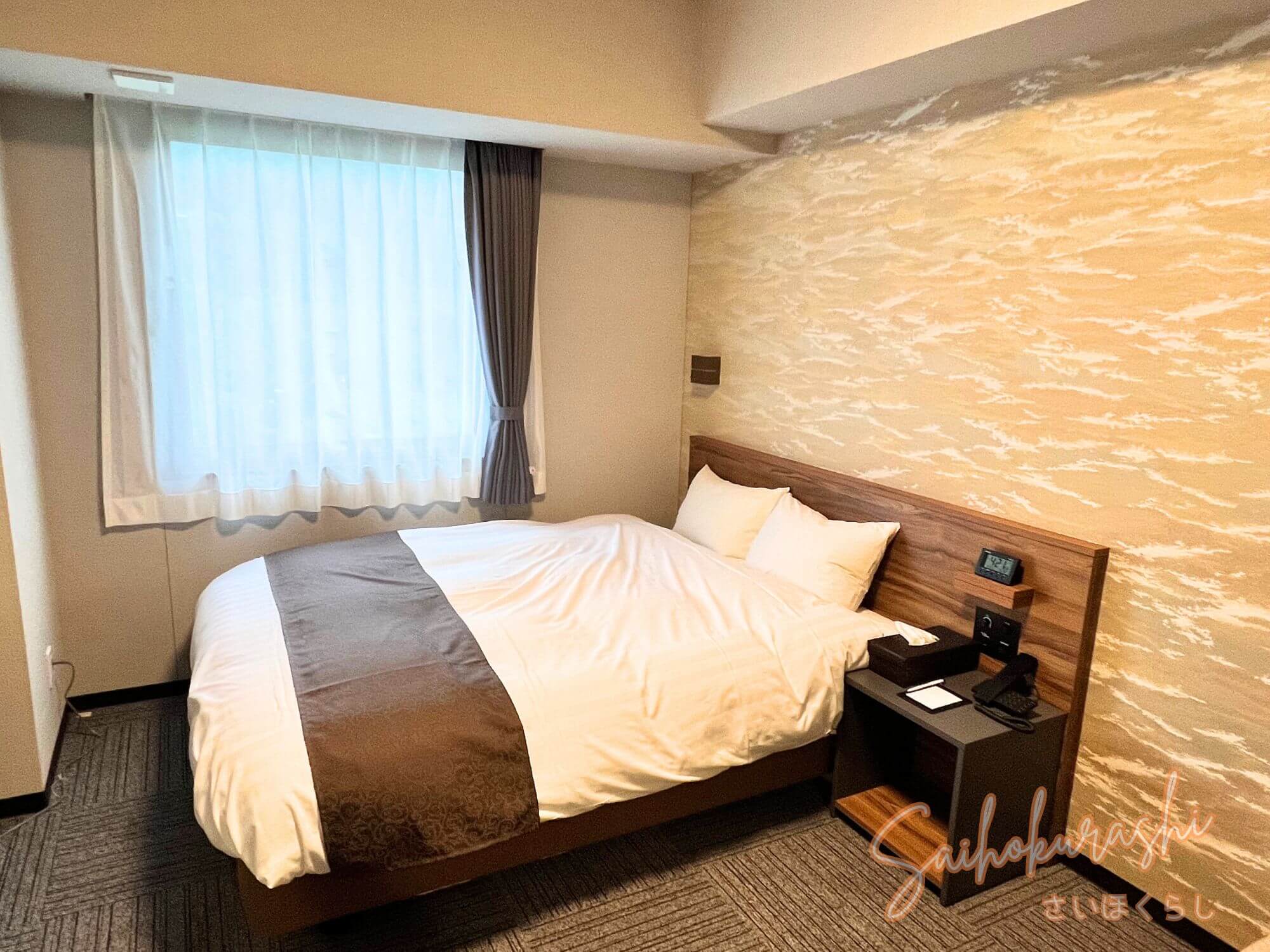 シングルとはいえ、140cm幅ダブルベッドが設置されており広々。