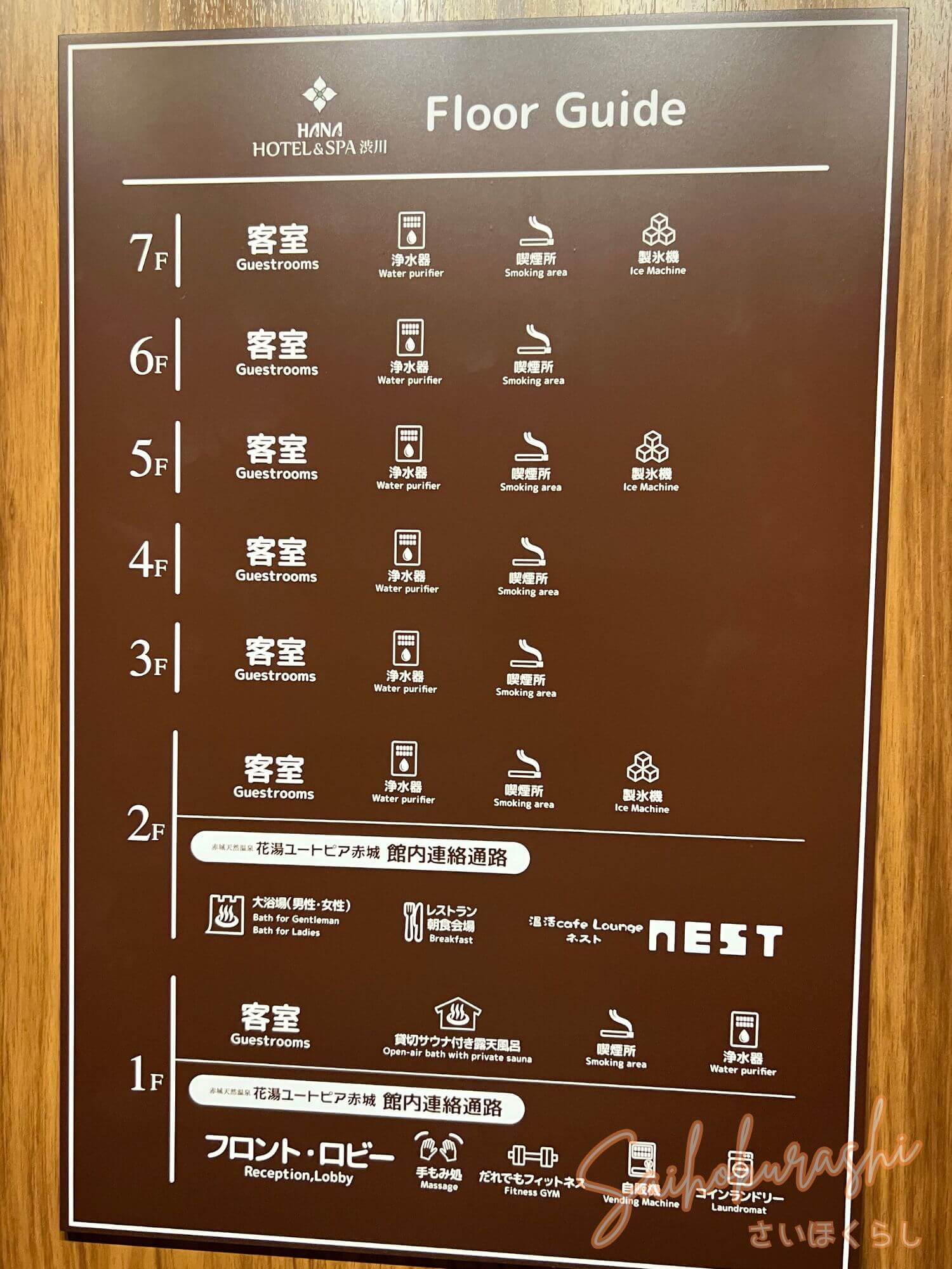 客室フロアは2階〜7階になりますが、全てのフロアに飲み放題の水(浄水器)と喫煙所が完備。