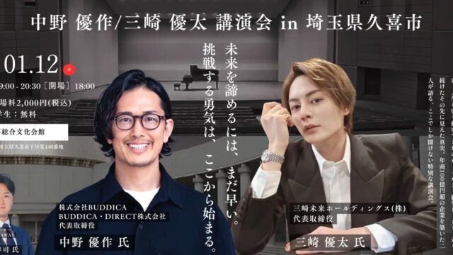イベント 【イベント】『中野優作 × 三崎優太』講演会が久喜市で開催決定|新成人は参加無料! 2025年10月30日 saikura https://saikura.info/wp-content/uploads/2025/11/saihokurashi_top_logo_2.png さいほくらし-埼玉北部・群馬南部のローカルメディア